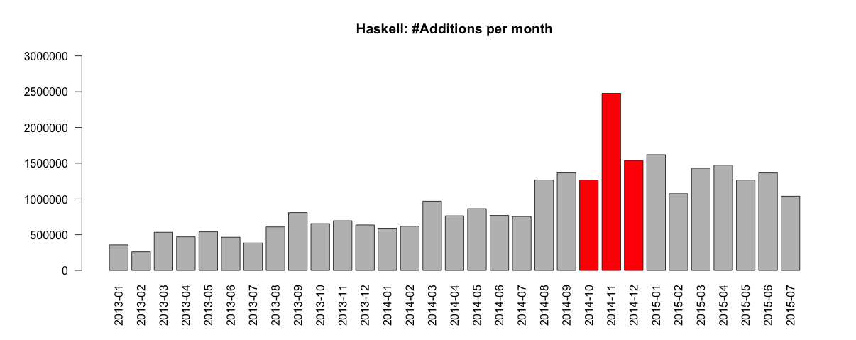 FP101x was taught in the red period. It is a sensible result: more Haskell code is written during the course by our learners. Most interesting though is what happens after the end of the course - Haskell enters a steady decline, it only takes a few months before pre-MOOC Haskell programming levels are reached.