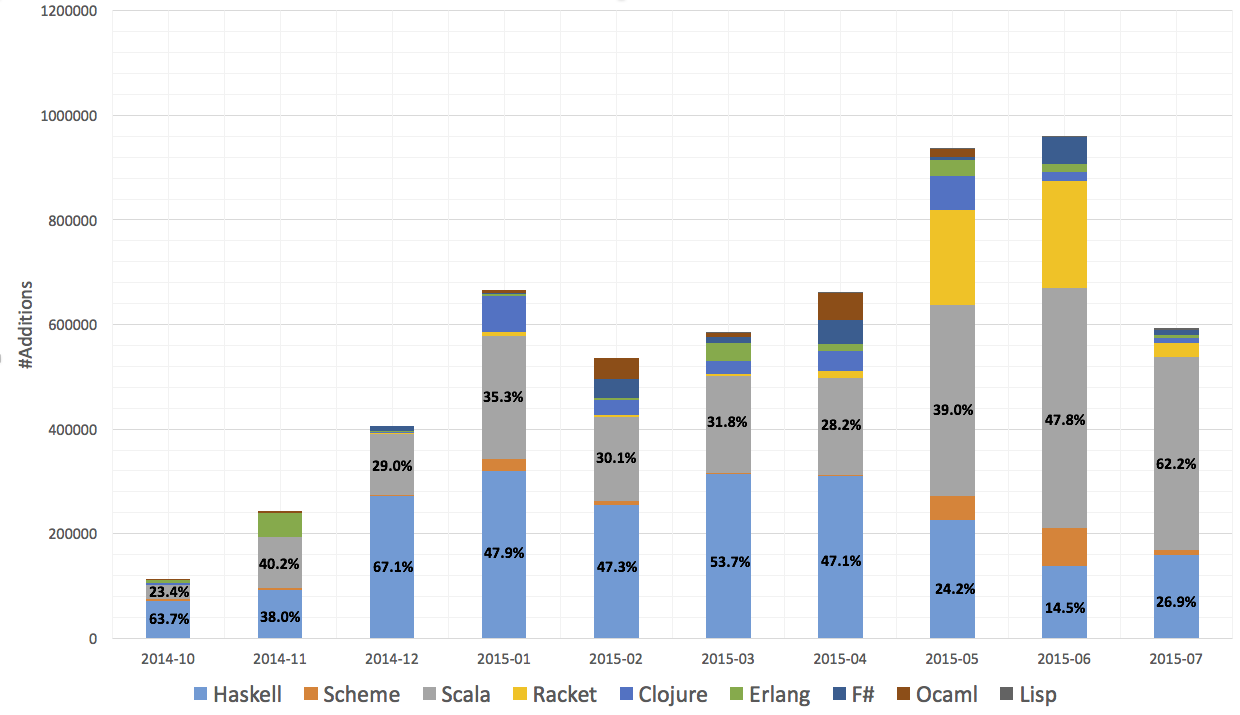 What is going on? We know that some learners did indeed transfer. However, those learners that stick with functional programming simply move on to other languages. Lets take a look at the code lines added over time across a range of functional languages. In this plot, we only considered the subset of learners that had never functionally programmed before FP101x and began programming functionally afterwards (i.e. we can be quite certain that the MOOC impacted their knowledge and skills):