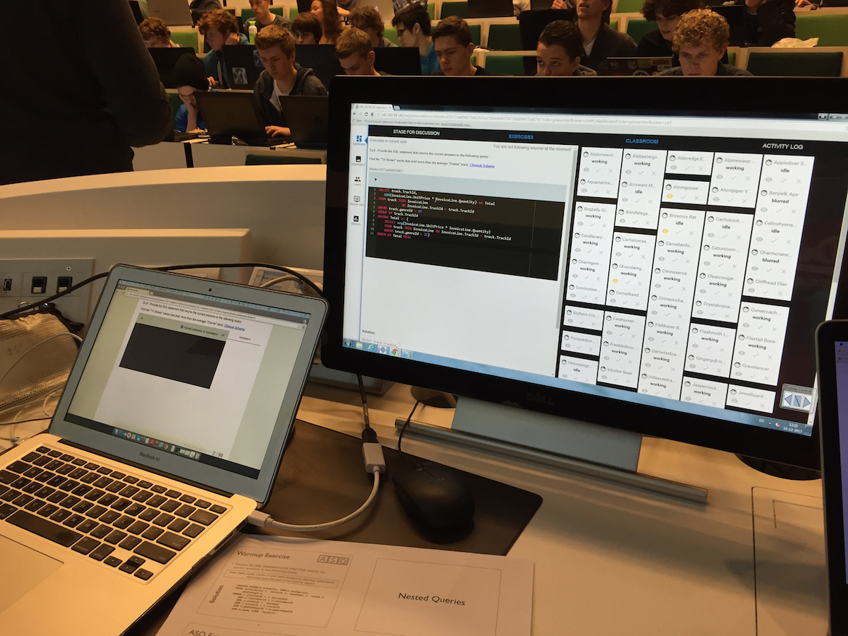 ASQ is not yet a product, it is a prototype and requires effort to set up locally (it is open-source). It is not as simple as replacing PDFs or Powerpoint slides with a few HTML slides. It also requires effort to create good complex questions (those you have to develop yourself). But still, it was worth it. The lectures I did with ASQ were more interactive than the rest (here I fell back on multiple choice); I was more comfortable lecturing, as suddenly I did not have to guess anymore what content the students had grasped, I could see it clearly in their responses to the exercises. The students enjoyed it, and they got a real sense of the knowledge they possessed (or the lack of it).