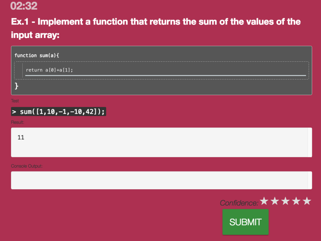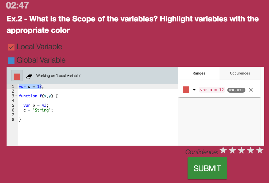 In this question the students are asked to demonstrate their understanding of JavaScript’s concept of scope by highlighting the variables that are local and global. Once the students are satisfied with their answer, they submit the solution.