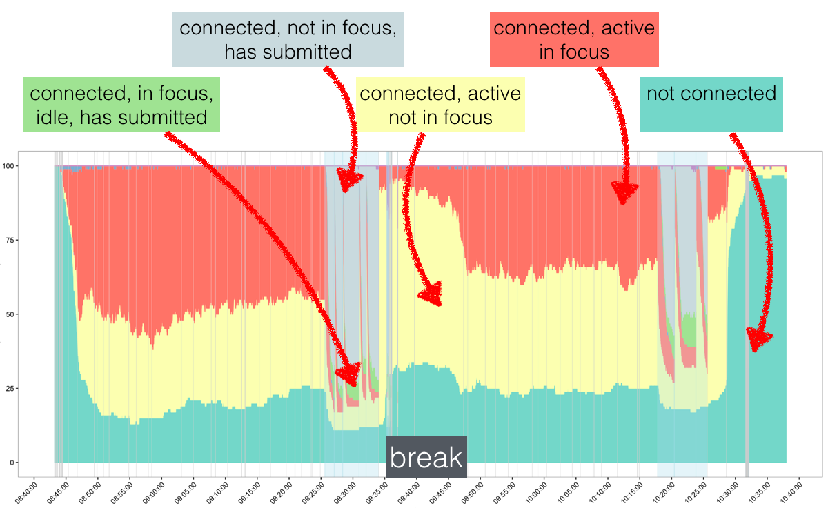 Not the prettiest graph (yet), I admit, but very insightful nevertheless. The lecture starts at 8:45am, has a 15 minute break between 9:30 and 9:45 and ends at 10:30. The barely visible grey lines are slide transitions and the eight spikes of certain event combinations appear when exercises were incorporated into the slides. The y-axis shows the number of students that, at each moment in time, belong to a certain category: red (the students are doing something with the ASQ window/tab in focus), yellow (the students are doing something with the ASQ window/tab not in focus), green (the students submitted the answer to an exercise and are not doing anything else) and grey (the students submitted the answer to an exercise and are doing something else). The break interval provides a good baseline: during the break, we see a lot of students in the yellow category and few in the red one. This should be the other way around during the lecture - although this is indeed the case, we also observe that as the lecture progresses more and more students turn from red to yellow, indicating that fewer students pay attention towards the end of the lecture. Each of the eight spikes indicates an exercise that took place, when the students suddenly “snap back” and focus on the lecture content. ASQ can provide much more than this one analysis, I hope though, this gives a first impression on what it is all about.