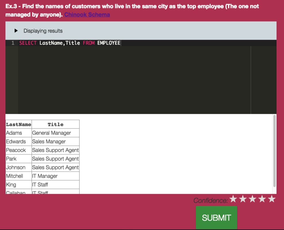 Students can also write SQL queries themselves without having to install any database. Everything runs in the browser, as soon as the students see the question they can start honing their SQL abilities.