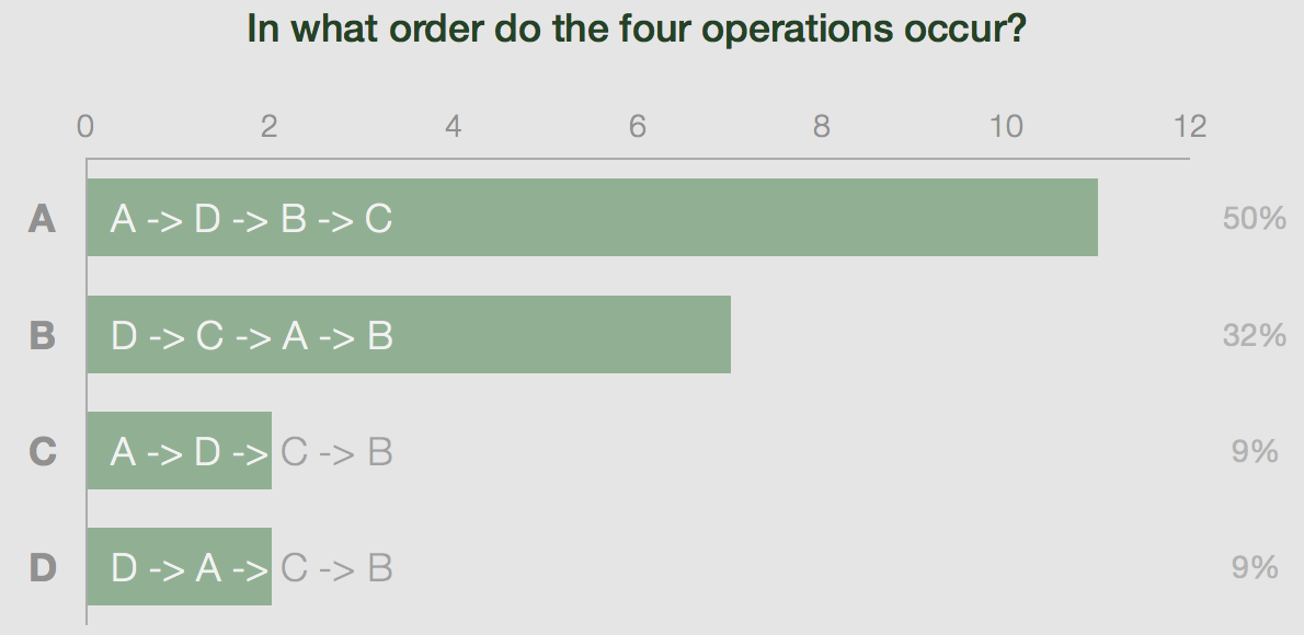 All I know is that 9% of the students got it right - I have no idea why the rest of the class failed to answer the question correctly. I either have the choice to take a stab in the dark and explain some of the material one more time or I move on to the next topic. Both options are unsatisfactory for the students and myself. Even worse, multiple-choice questions may lead students to think that they know how a concept is applied (they got the answer option right!), without actually ever applying it.