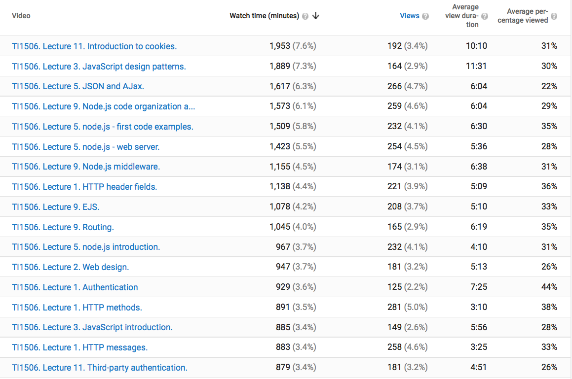 None of the screencasts hits 300 views, indicating that not all students feel the need to rely on them to prepare for their tests. None of the lectures reached an average of 50% view time (Average percentage viewed column). This is maybe not surprising, every MOOC video guide nowadays suggests to cut down the lecture videos to seven minutes or less (which corresponds roughly to the Average view duration column), whereas my screencasts are between 15 and 35 minutes long.