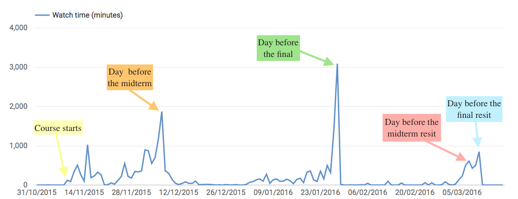 Did any of the students actually watch the screencasts? I hoped so, considering the fact that attendance declined considerably over time (from >300 students at the beginning to ~180 students in the last lecture). Since we uploaded all screencasts to YouTube, analytics are available with the click of a button. To make sense of the graph, I also added the four (for the students) important milestones of the course: the midterm and final as well as their resits.