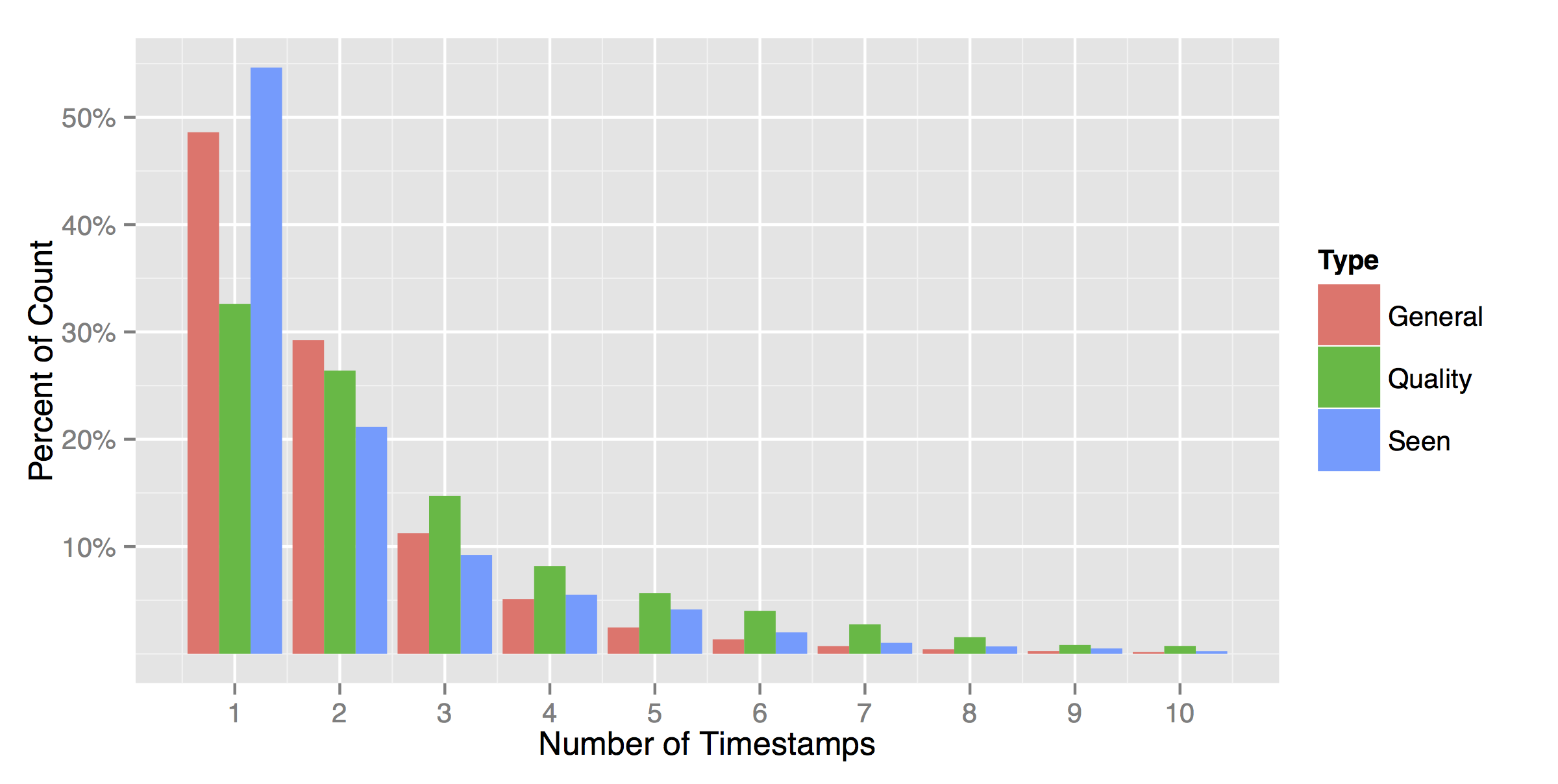 The plot shows what percentage of documents have had their content created at 1, 2,…, 10 different points in time. Only about a third of the Quality set documents were created at a single point in time, meaning that our simplifying assumption is violated for the majority of Web documents we care about (those high-quality ones). The plot also shows that having more than 5 different creation timestamps is quite rare, i.e. very few documents are updated more than a handful of times.
