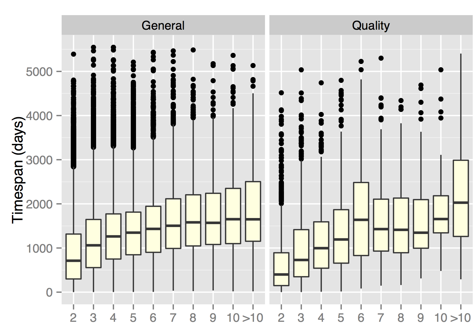 We partitioned the document sets according to how many different creation timestamps we found and computed the timespan between the earliest and most recent timestamp in days. Evidently, few documents have small timespans, the median timespan for documents of the General set with 2 creation timestamps exceeds 500 days (i.e. more than a year passes between updates!); in the Quality set, the median exceeds 300 days. As we would expect, the median timespan increases when we look at documents with 3 or more creation timestamps.