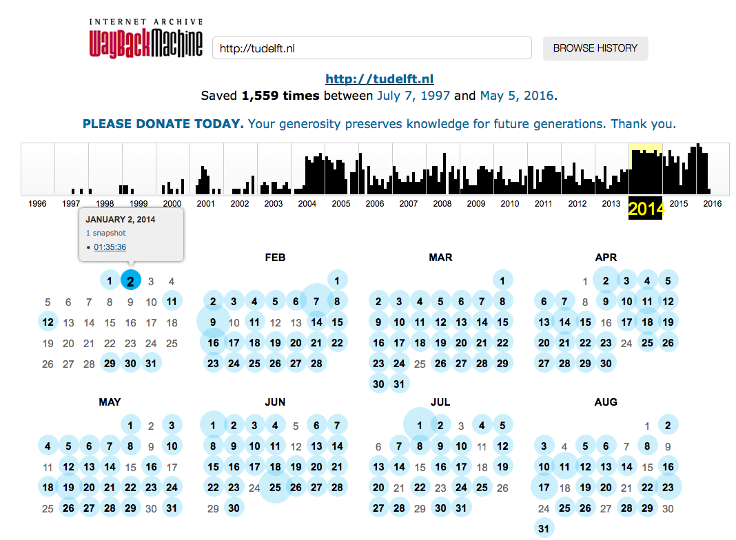 The URL http://tudelft.nl tends to be crawled once a day, and between July 1997 and May 2016 it has been crawled a total of 1,599 times - these are the historic versions we base our analysis on.