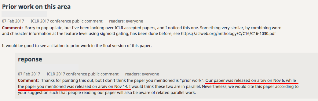 The conference is dominated by Google/Google Brain/DeepMind and Montreal - it is hard to find papers where none of the authors has an affiliation to one of those organisations. Dominant topics are GANs, program generation, scalability issues, compression, reinforcement learning and (oddly to me) textures. The conference runs an interesting submission process: all submissions are public at submission time and non-blind. Reviewers (who are anonymous) and chairs also perform the review in public and anyone who is interested can comment on any submission at any time. Authors are invited to change their submissions in response to reviewer comments. Authors (anyone really) can also comment on the reviews. And even though the conference is in full swing, the whole process is still publicly available at the OpenReview website (it may take 1-2 minutes to load on a slow machine). What should also be mentioned is the fact that many authors concurrently with the submission (or before) post their work on arXiv.org as in deep learning research weeks or even days count to claim ownership of an idea as this comment-reply examples illustrates: