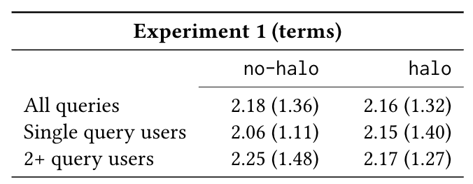 users and users submitting a single query only in that period (bottom two rows), we also do not observe any effect of the halo on user behaviour.