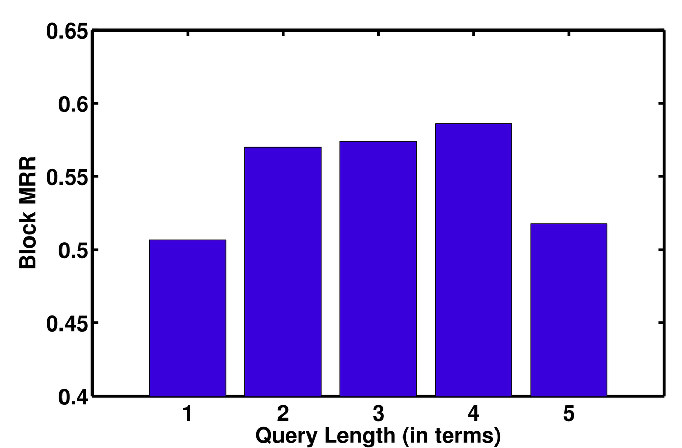 Here, we plotted how well queries of a certain length perform in (block) mean reciprocal rank. Higher is better. We observe that queries of lengths 4 perform best, queries of length 5 or more lead to a strongly degrading system performance. So yes, it would have made sense for our users to create longer queries (at least longer than 2 terms).